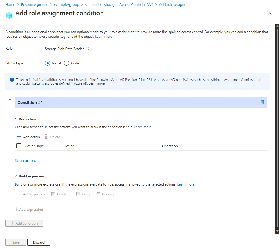 - 在“ 条件”(可选) 选项卡上,选择“ 添加条件”。 此时会显示“添加角色分配条件”页: