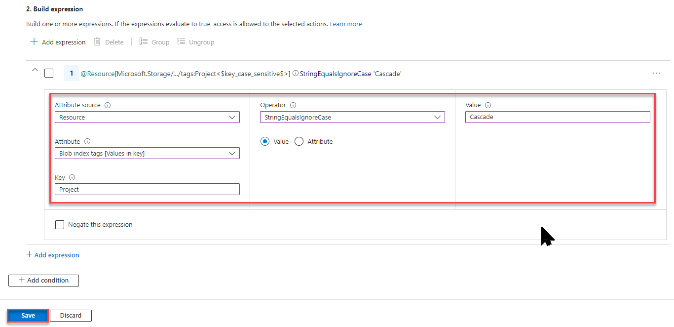 在本教程中,将限制对具有特定标记的 Blob 的访问。 例如,向角色分配添加条件,以便 Chandra 只能读取带有标记 Project=Cascade的文件。