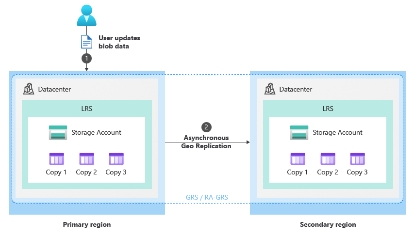 将帐户重新配置为利用 GRS 后,Azure 将开始以异步方式将数据复制到新的次要区域 (1),如下图所示: