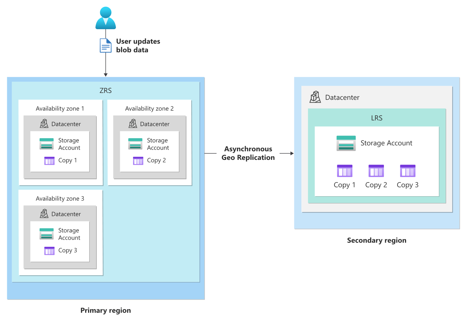 当存储帐户配置为异地区域冗余存储 (GZRS) 或读取访问异地区域冗余存储 (RA-GZRS) 复制时,区域冗余存储 (ZRS) 主要区域中的数据是区域冗余的,并在 LRS 次要区域内复制三次。 如果帐户配置为读取访问 (RA),则只要该区域的存储服务终结点可用,就可以从次要区域读取数据。