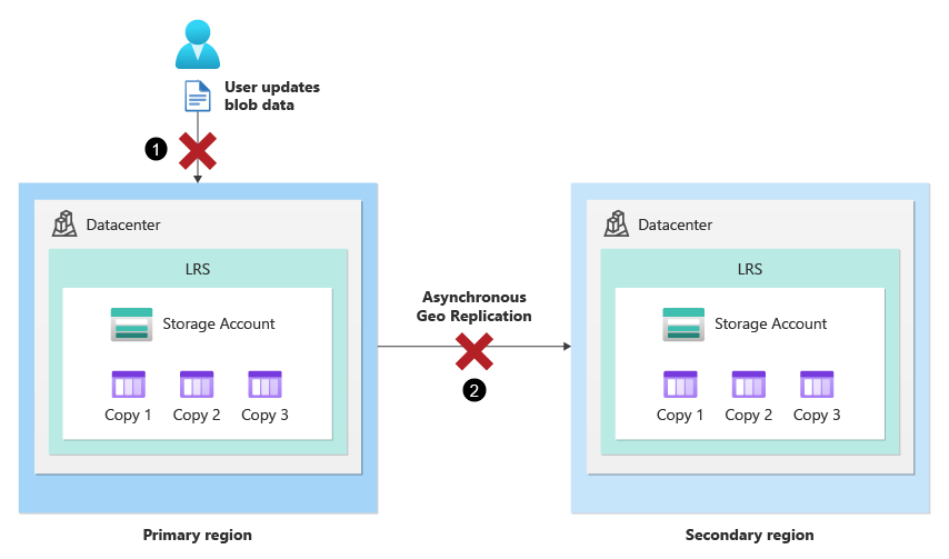 如果主要存储服务终结点因任何原因而不可用 (1),则客户端将无法再向存储帐户写入数据。 根据中断的根本原因,复制到次要区域的副本可能不再正常运行 (2),因此预期会丢失一些数据。 下图展示了主要终结点不可用、但在执行恢复之前的情况: