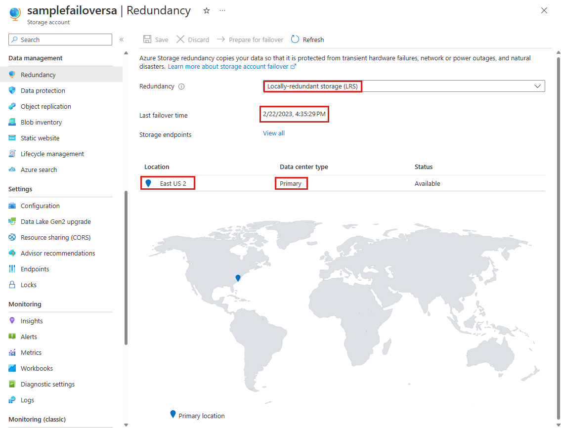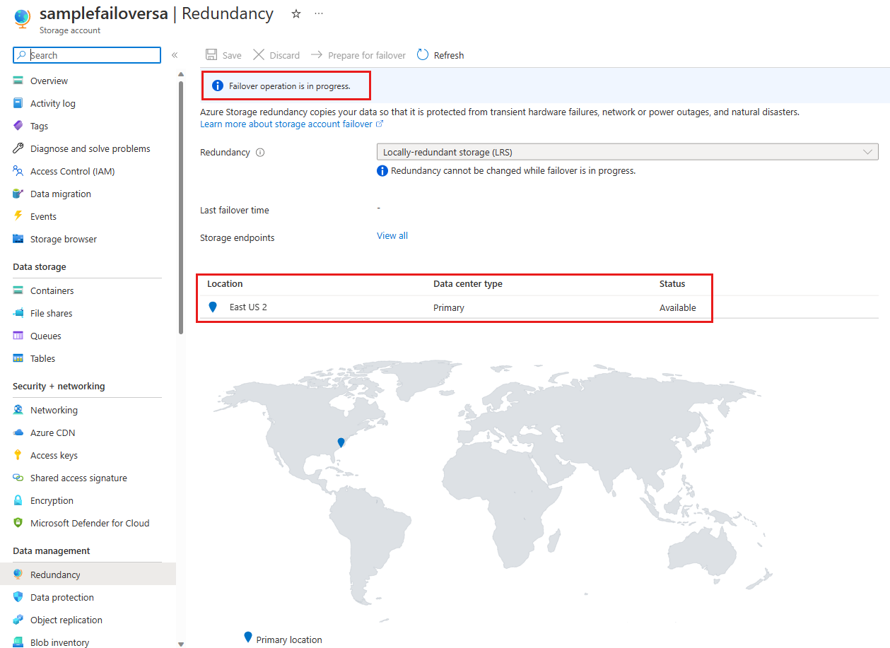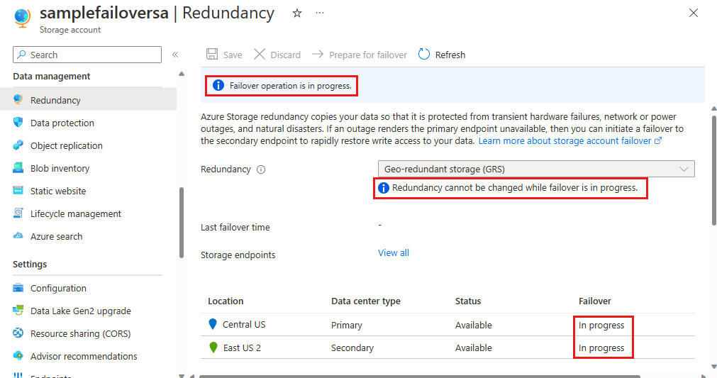 从数据管理组中选择冗余。 下图显示了存储帐户的异地冗余配置和故障转移状态。