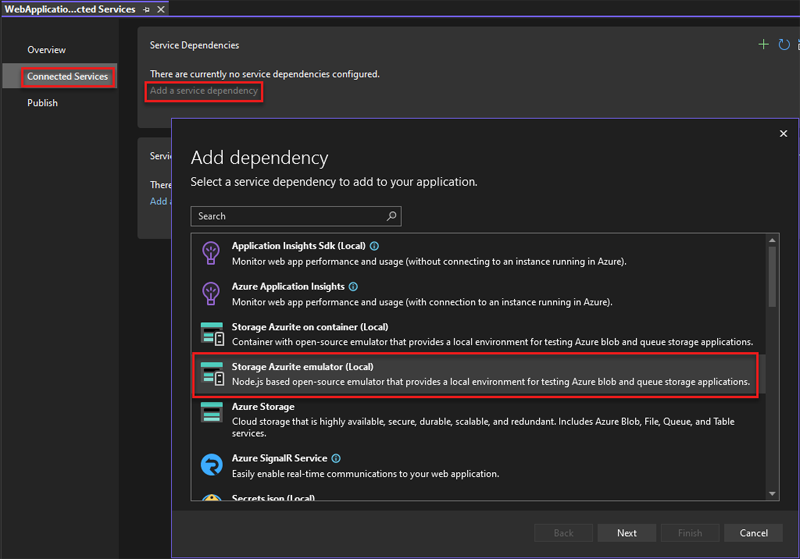 在 Visual Studio 2022 中,创建 ASP.NET 核心 Web 应用 项目。 然后,打开 “连接服务 ”对话框,选择 “添加服务依赖项”,然后选择“ 存储 Azurite 模拟器”。