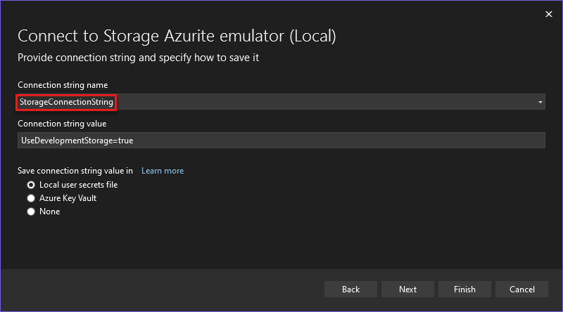 在“ 配置存储 Azurite 模拟器 ”对话框中,将 “连接字符串名称 ”字段设置为 StorageConnectionString“ 完成”。