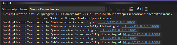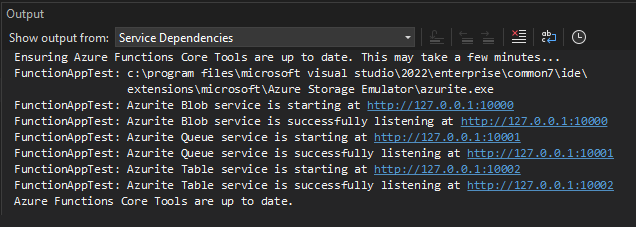 创建项目后,Azurite 会自动启动。 Azurite 可执行文件的位置在 Azurite 可执行文件位置表中详细介绍。 输出类似于以下屏幕截图: