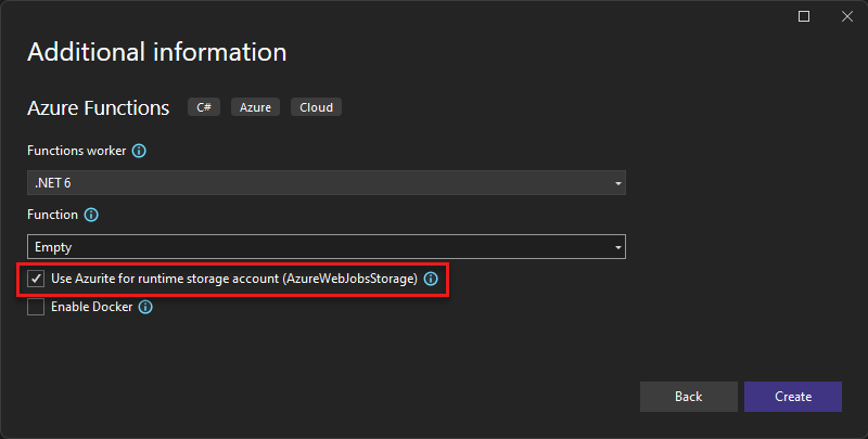 在 Visual Studio 2022 中,创建 Azure Functions 项目。 设置项目选项时,将标记为 “使用 Azurite 用于运行时存储帐户”的框进行标记。
