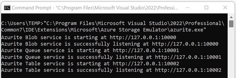 导航到相应的位置并启动 azurite.exe。 运行可执行文件后,Azurite 将侦听连接。