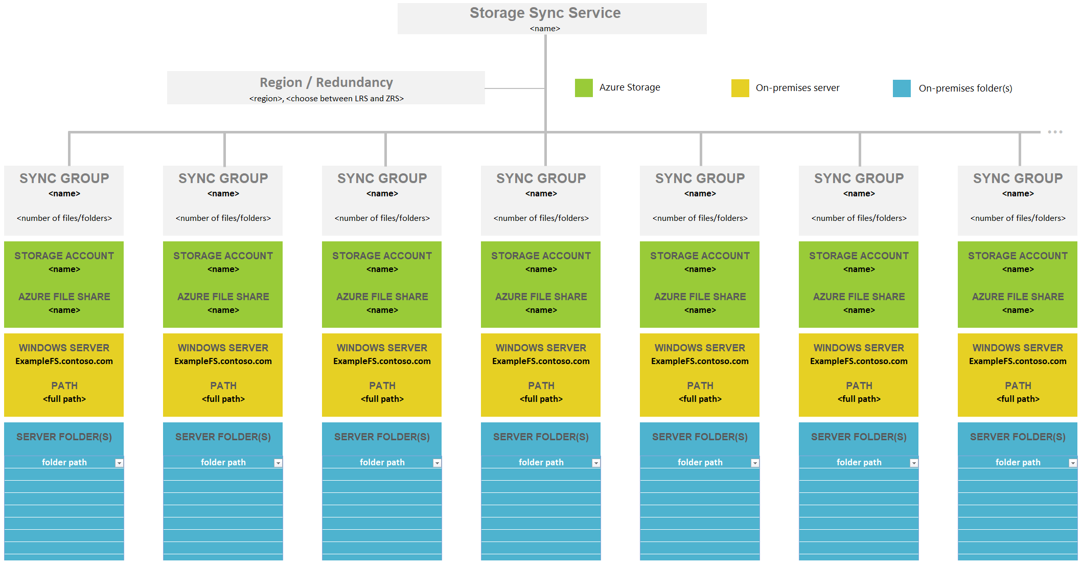 根据此信息,通常需要将存储卷上的多个顶级文件夹分组到一个新的公共根目录。 然后,将此新根目录以及分组到其中的所有文件夹同步到单个 Azure 文件共享。 此方法使你可以维持在每台服务器 30 个 Azure 文件共享同步的限制范围内。