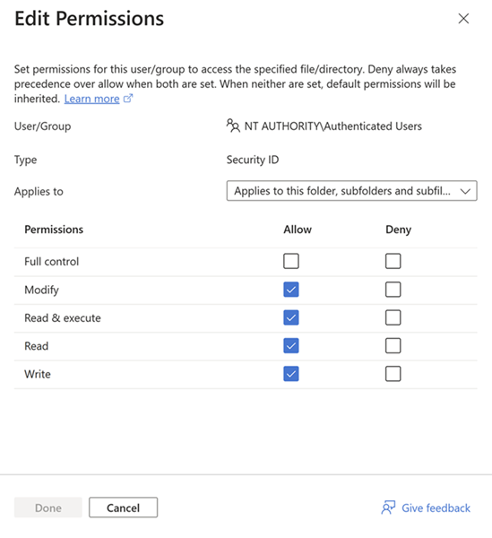 虽然共享级别权限(RBAC)充当高级守护程序,用于确定用户是否可以访问共享,但 Windows ACL(NTFS 权限)在更精细的级别运行,以控制用户可以在目录或文件级别执行的作。 可以在根、目录或文件级别设置 Windows ACL。