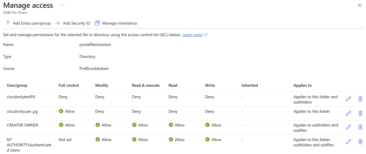 如果将 Entra Kerberos 配置为标识源,则可以使用 Azure 门户为每个 Entra 用户或组配置 Windows ACL。