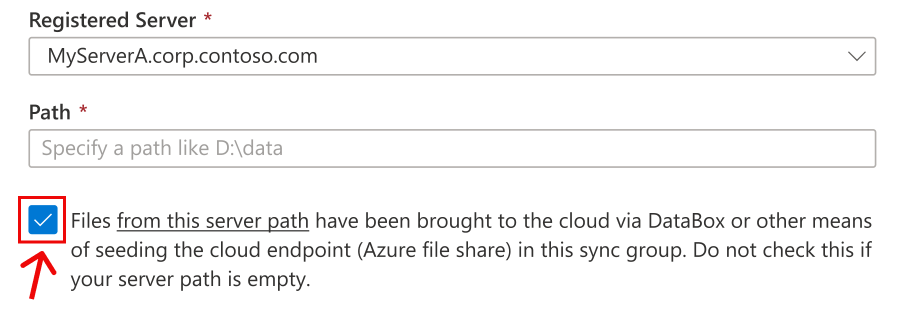 进入“创建服务器终结点”向导后,利用文件夹路径下提供的复选框。 仅在输入一个路径,使其指向的文件和文件夹结构与 Azure 文件共享中相同(Data Box 已将此命名空间的文件和文件夹移入其中)时,才选择此项。