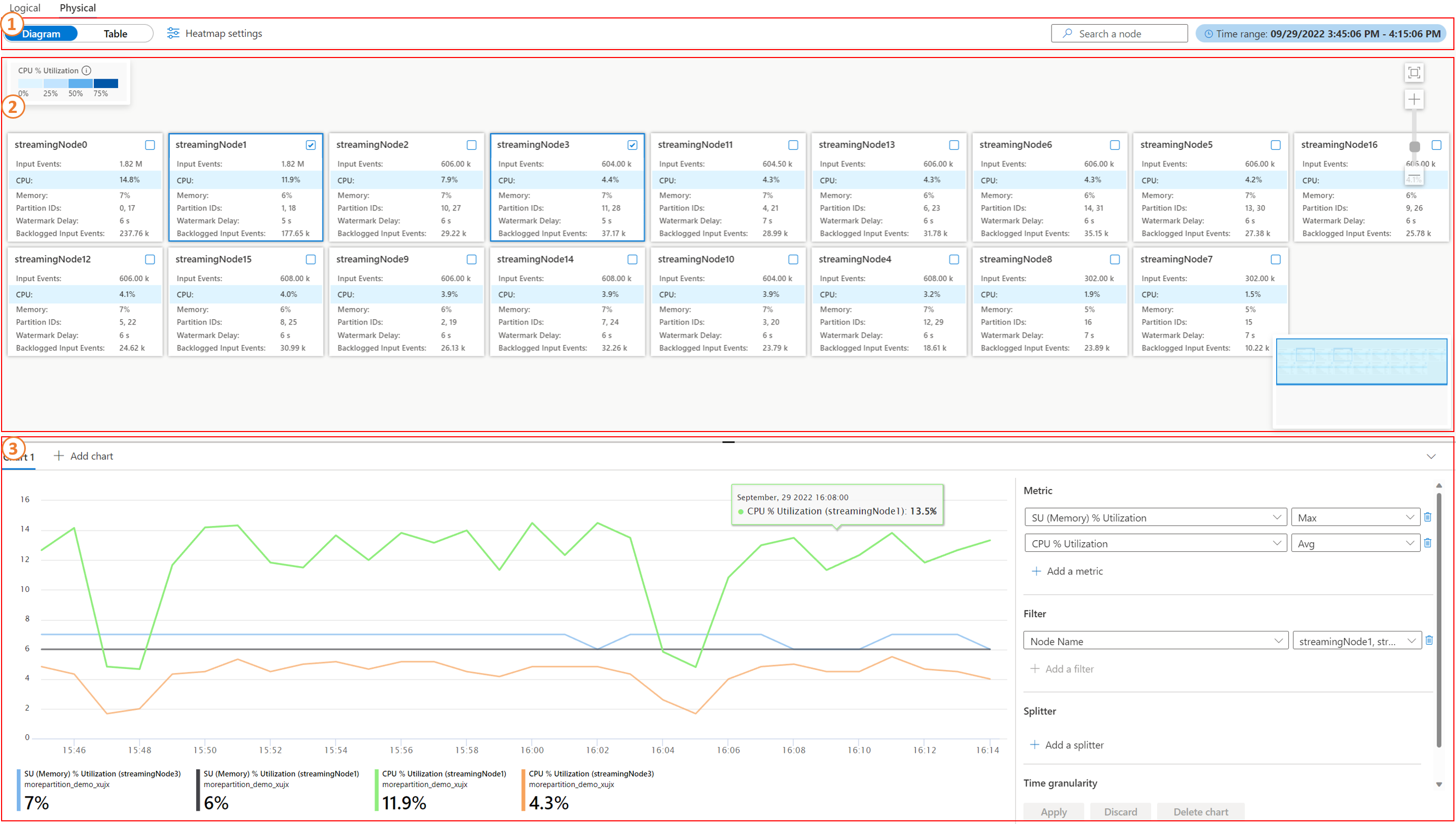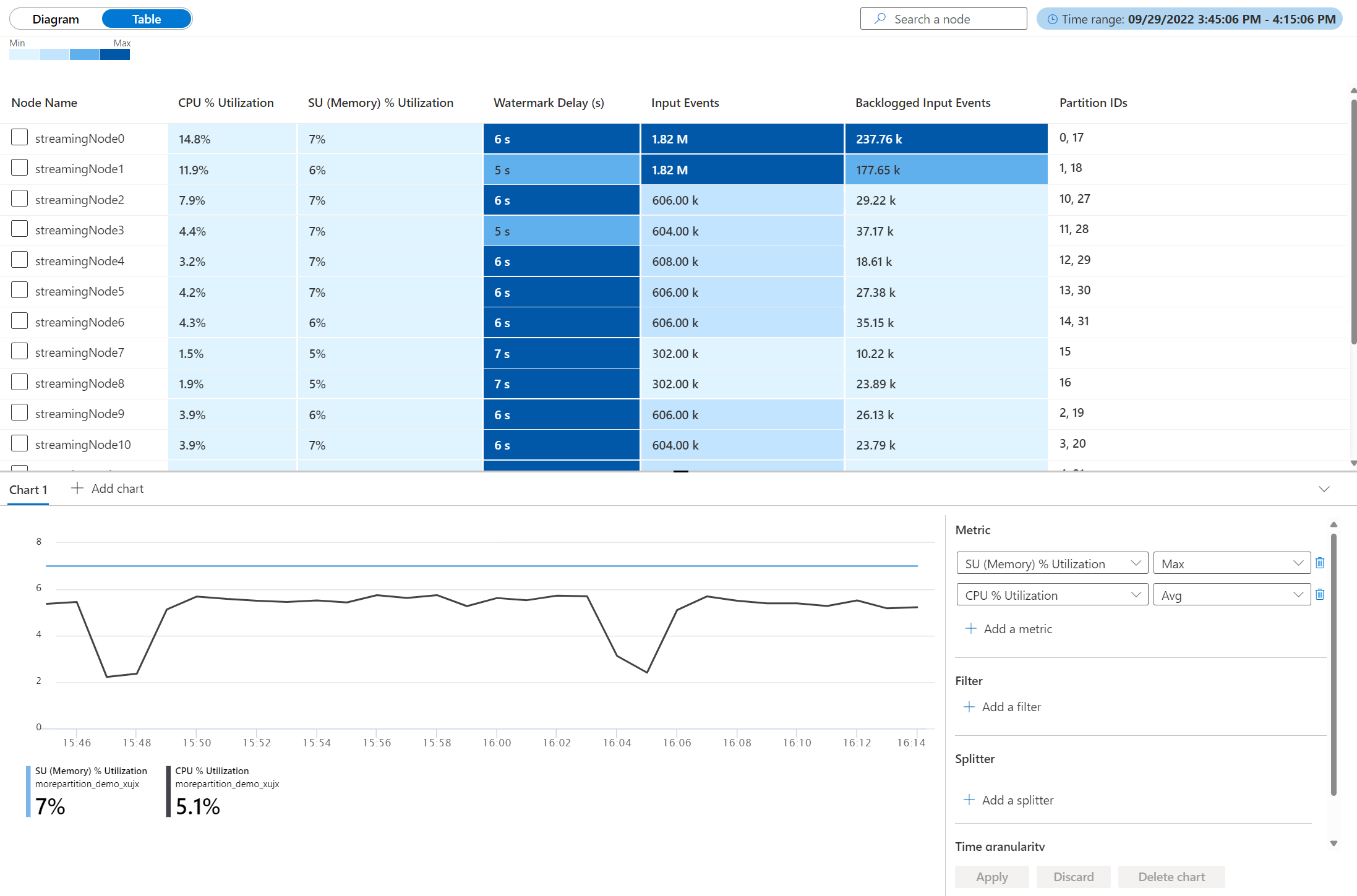 关系图/表部分:可在其中使用关系图视图或表视图查看流式处理节点级别的指标(所选时间范围中的聚合指标)。 本部分中的每个框都表示一个用于处理输入数据的流式处理节点。 每个节点上的指标包括: