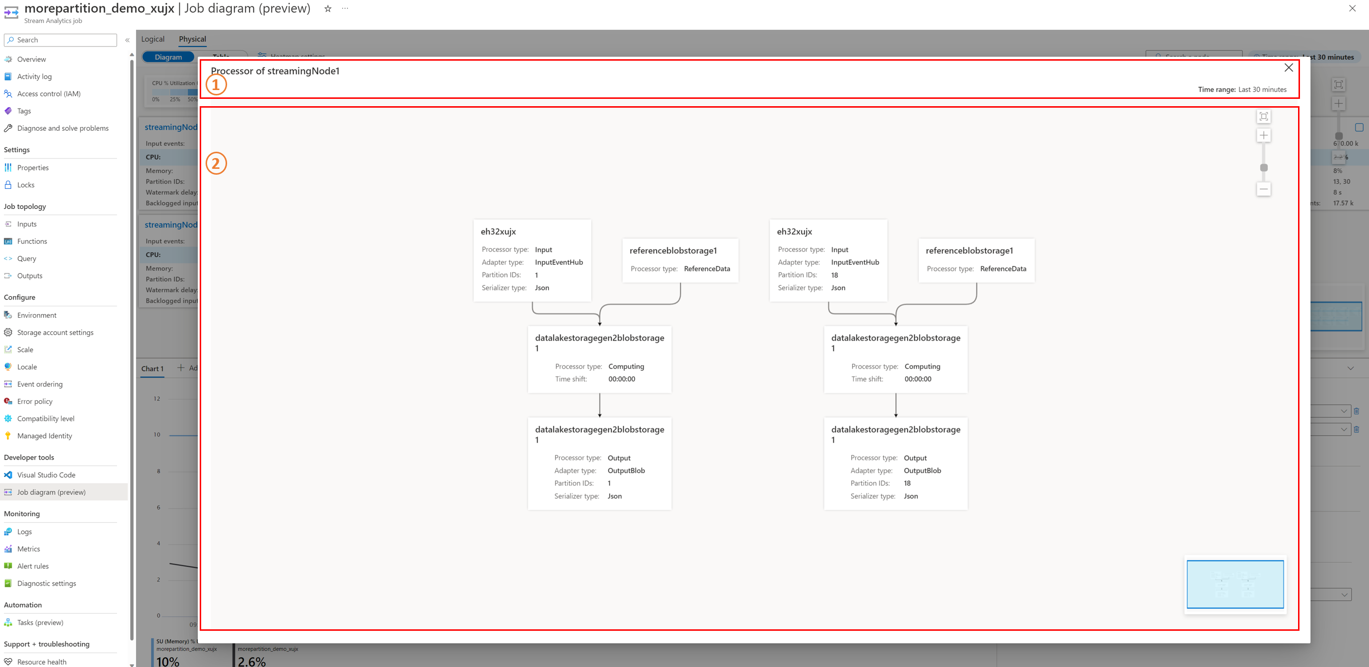 关系图部分:此部分中的节点框表示作业的输入、输出和查询步骤。 可以直接查看节点中的指标,或通过单击本部分中的特定节点在图表部分中以交互方式查看其指标。 有关指标定义的详细信息,请参阅 Azure 流分析节点名称维度。
