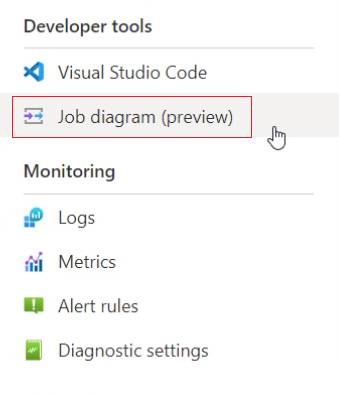 在 Azure 门户中,找到并选择流分析作业。 然后在“开发人员工具”下选择“作业关系图(预览)”: