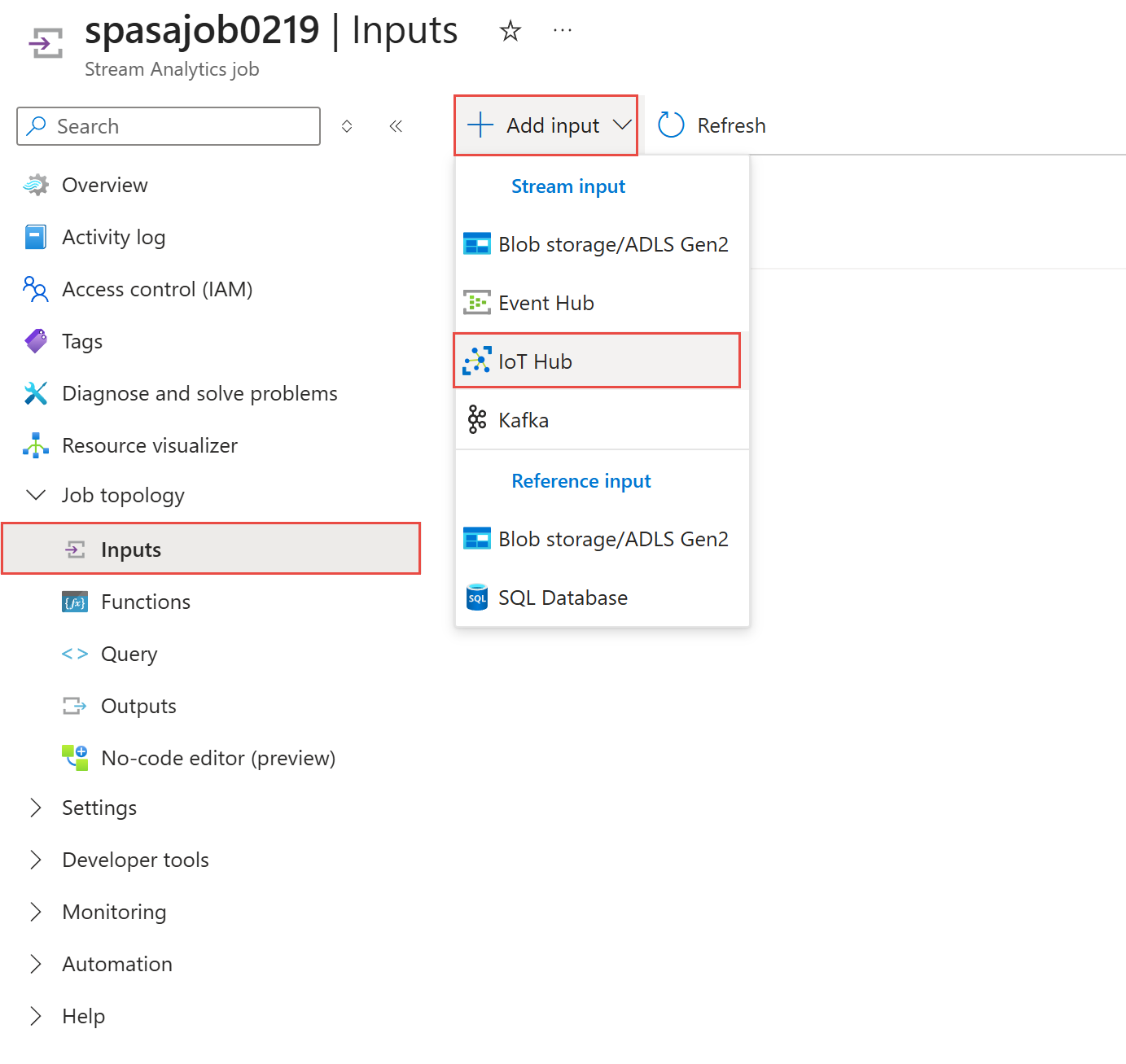在流分析作业页上,在左侧菜单中的“作业拓扑”下选择“输入”。