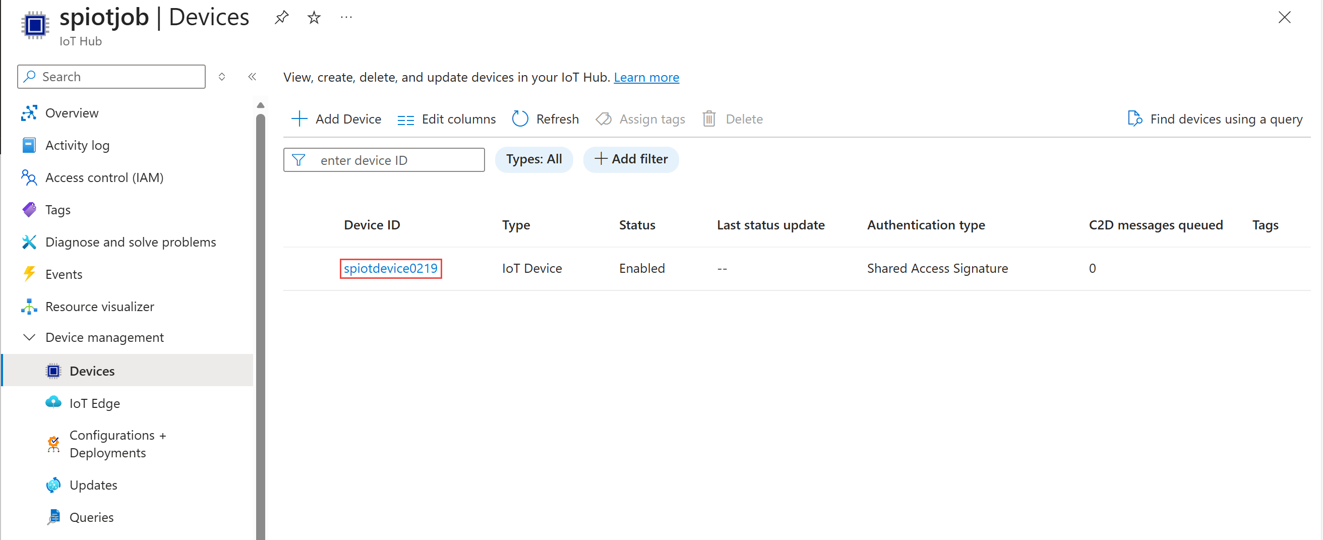 创建设备后,可在 IoT 设备 列表中看到设备。 如果未看到,请选择页面上的“刷新”按钮。