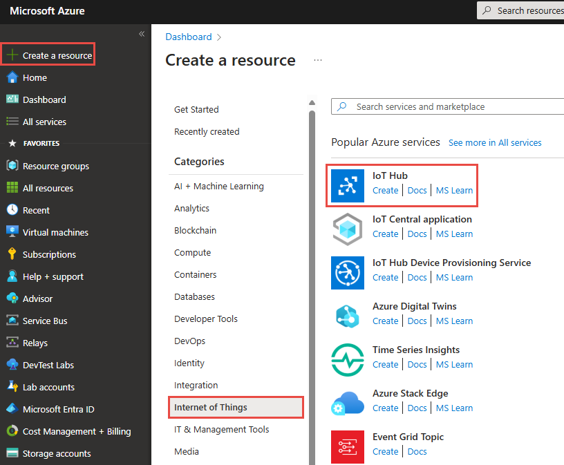 选择“创建资源”。 在“创建资源”页中,选择“物联网”“IoT 中心”。
