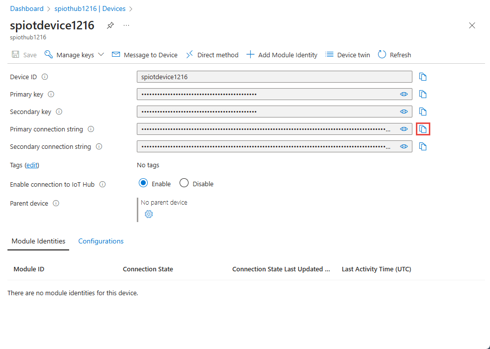 在“设备”页面上,选择“主连接字符串”旁边的复制按钮,并将其保存到记事本以供稍后使用。