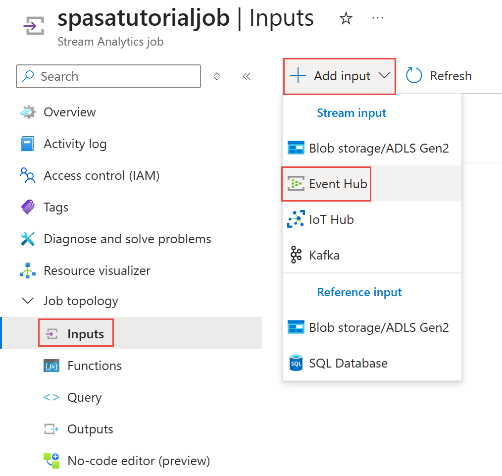 在“流分析作业”页上,在左侧菜单中的“作业拓扑”部分选择“输入”。