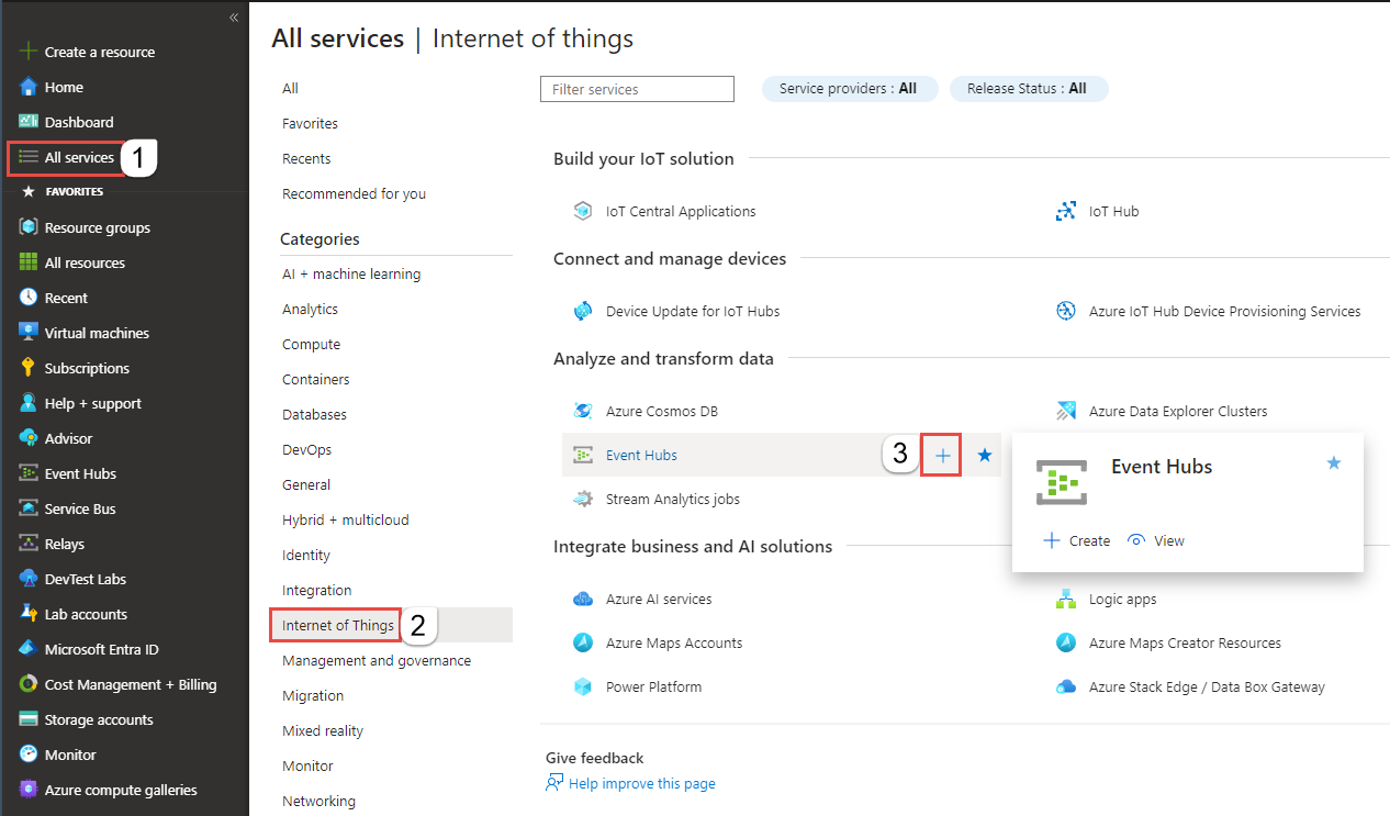 选择左侧菜单中的“所有服务”,选择“物联网”,将鼠标悬停在“事件中心”上,然后选择“+ (添加)”按钮。