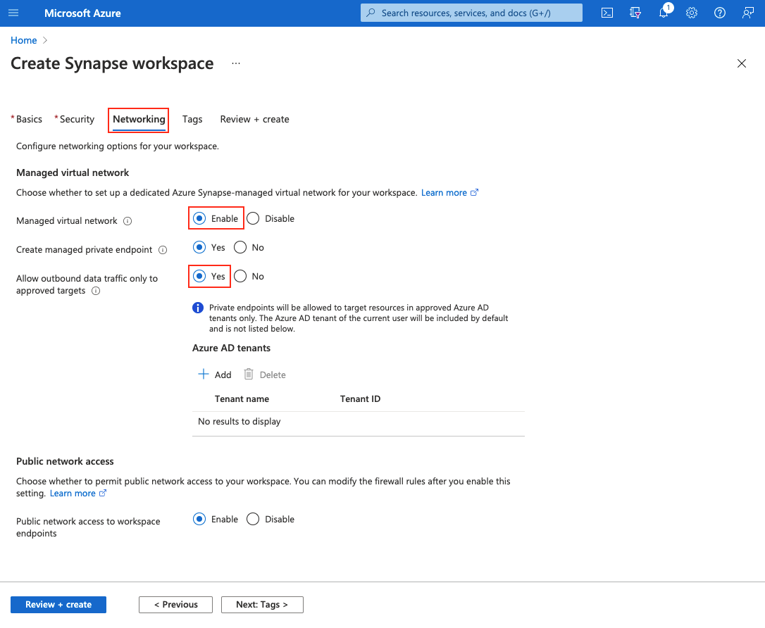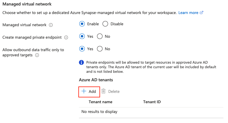 还可以控制从Azure Synapse工作区创建托管专用终结点的目标。 默认情况下,托管的专用终结点允许访问订阅所属的同一个 Microsoft Entra ID 租户中的资源。 如果您希望在与您的订阅所属租户不同的 Microsoft Entra ID 租户中创建托管的私有终结点,可以通过选择 + Add 来添加该 Microsoft Entra ID 租户。 可以从下拉列表中选择Microsoft Entra ID租户,也可以手动输入Microsoft Entra ID租户 ID。