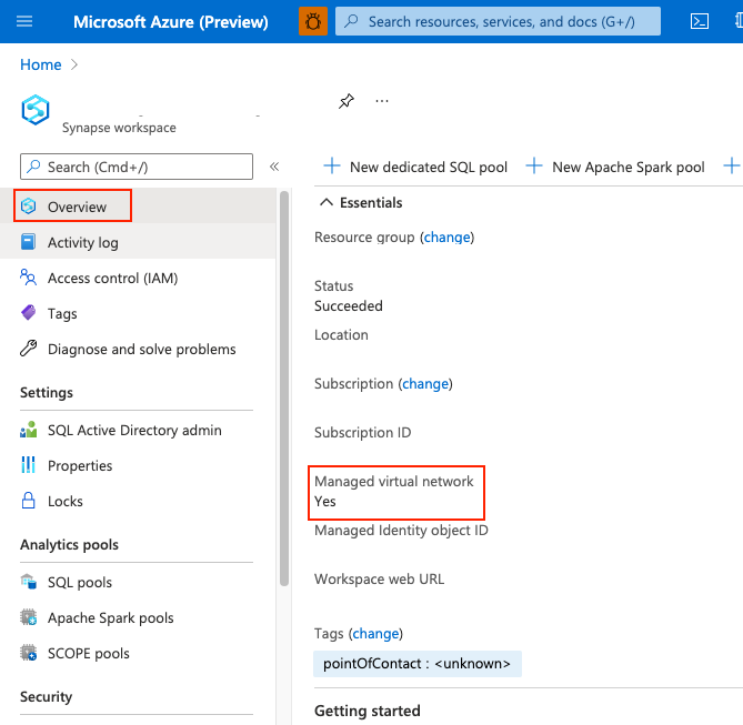 创建工作区后,可以通过从 Azure portal 中选择 Overview,检查Azure Synapse工作区是否关联到托管工作区Virtual Network。