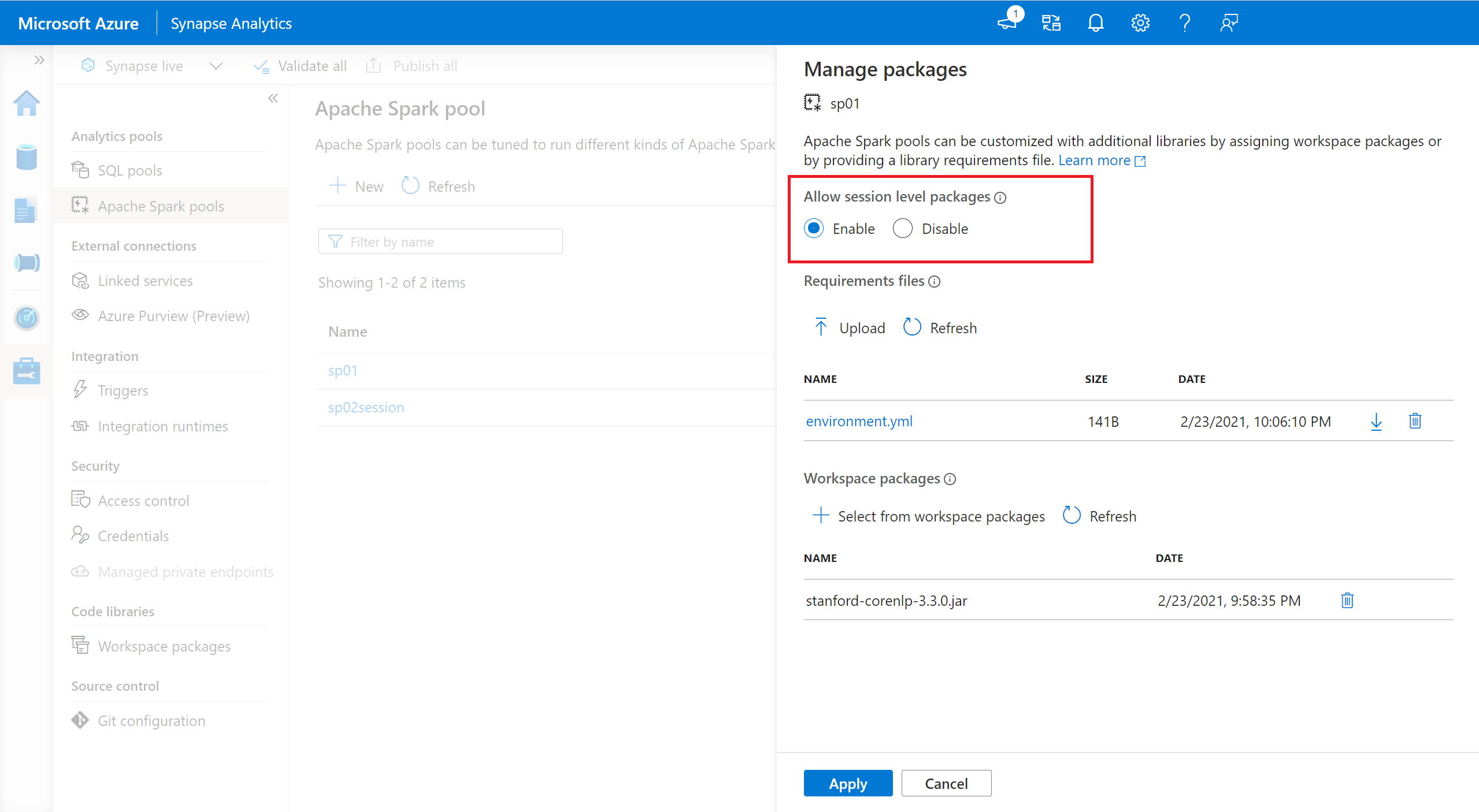 - 导航到所选的 Spark 池,确保已经启用会话级库功能。 您可以通过导航到管理>Apache Spark 池>包选项卡来启用此设置。