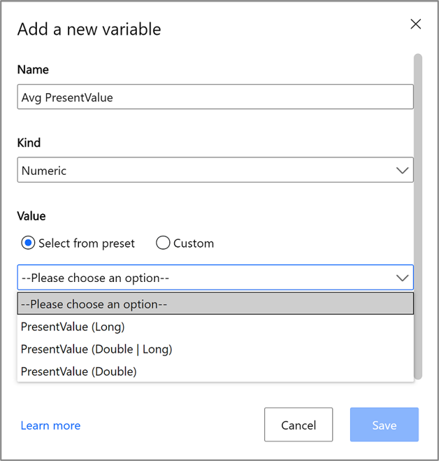 Azure 时序见解资源管理器提供了一种方法来自动联合同一设备属性的不同列。 在下面的示例中,传感器会发送一个 PresentValue 属性,该属性可以是 Long 或 Double。 若要查询 PresentValue 属性的所有已存储值(不管数据类型如何),请选择 PresentValue (Double | Long),系统会替你联合这些列。