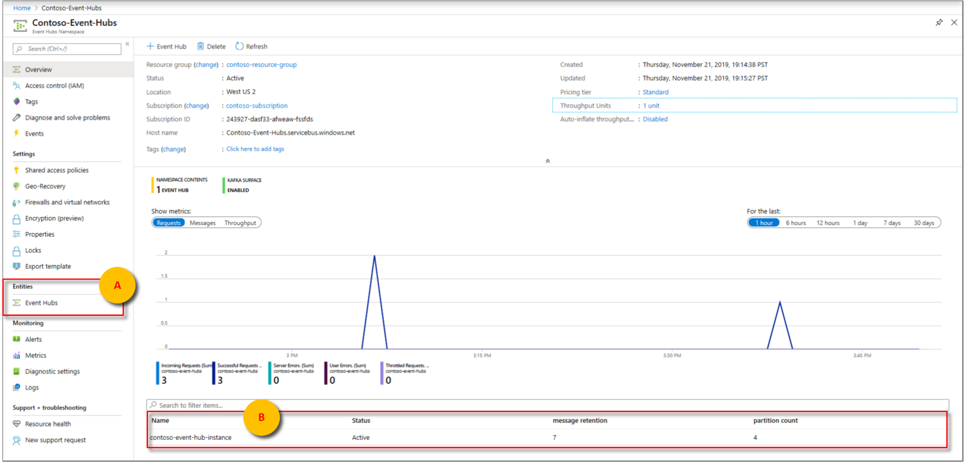 在 Azure 门户中,从事件中心命名空间的“概述”窗格中找到并打开事件中心实例。 选择“实体”“事件中心”,或在“名称”下查找实例。