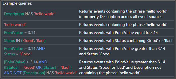 谓词:使用谓词可以使用下表中列出的操作数集快速筛选事件。 如果通过选择或单击执行搜索,谓词将基于该搜索自动更新。 支持的操作数类型包括: