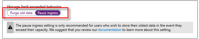 每个 Azure 时序见解环境都有一项附加设置:“超出存储限制时的行为”。 此设置控制达到环境最大容量时的传入和清除行为。 可以从两种行为中进行选择: