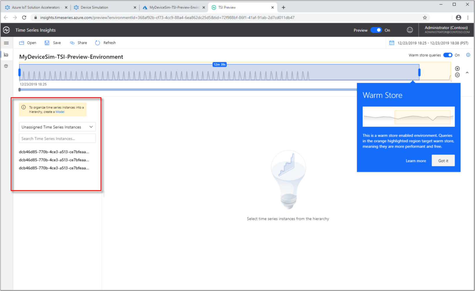 - 运行解决方案加速器示例,以将数据流式传输到 Azure 时序见解 Gen2 环境。