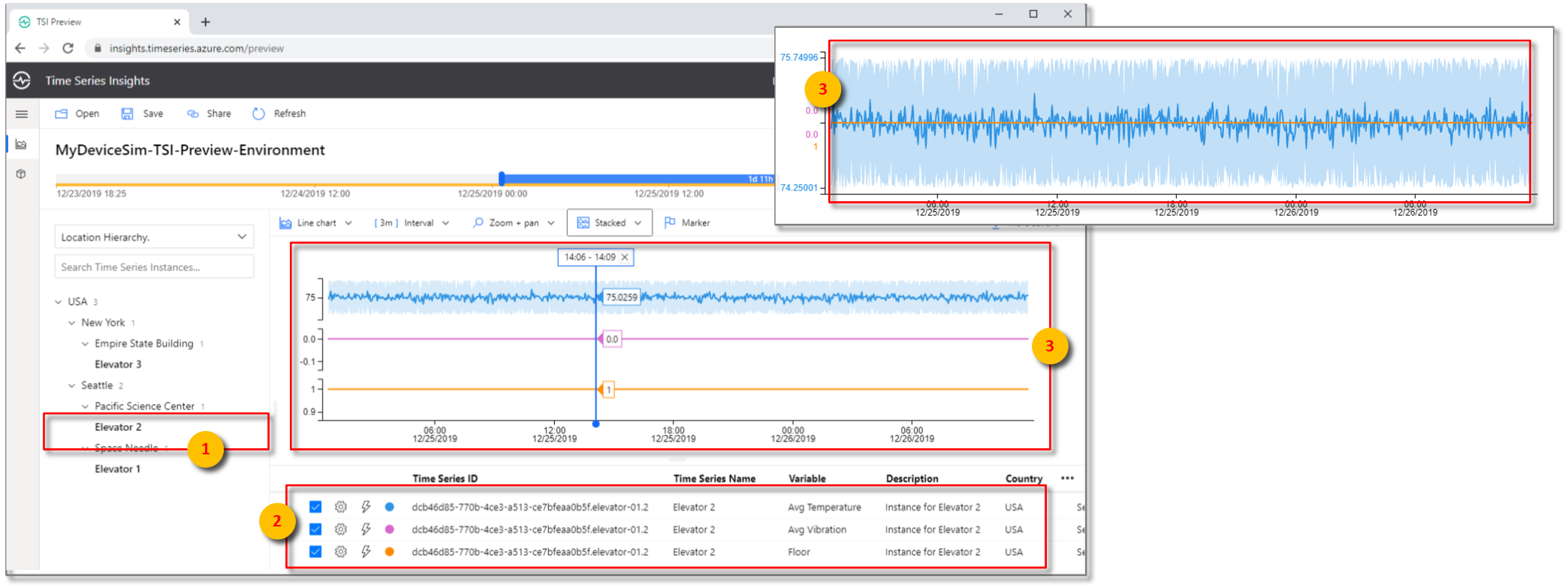 参数 操作 类型 选择“电梯”。 名称 输入“电梯 3” 说明 输入“电梯 3 的实例” 层次结构 选择“位置层次结构” 国家/地区 输入“美国” 城市 输入“纽约” 建筑物 输入“帝国大厦” 导航回到“分析”选项卡以查看图表窗格。 在“位置层次结构”下展开所有层次结构级别,显示时序实例: