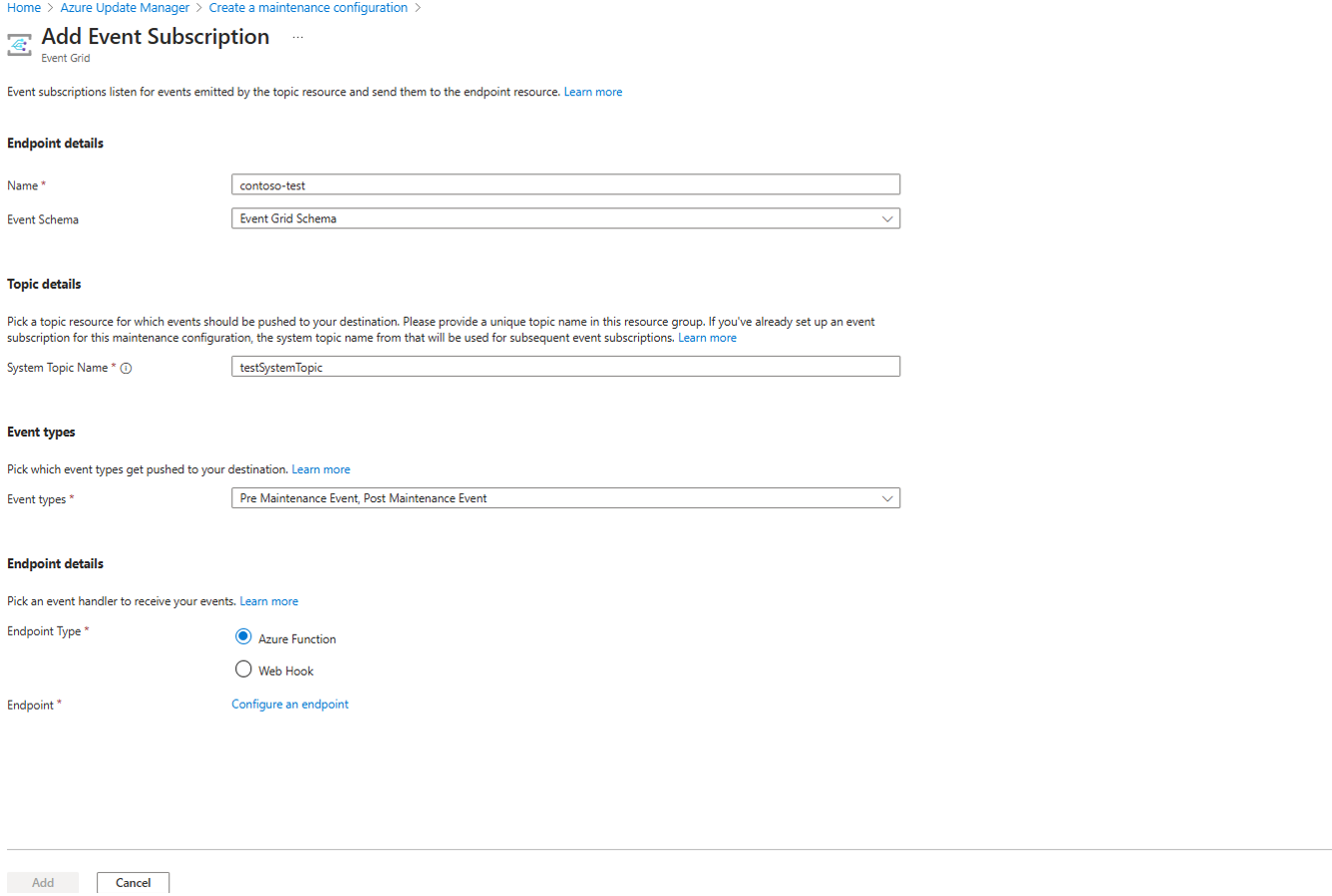 在上述流中,Webhook 和 Azure Functions 是可从中选择的两个事件处理程序/终结点。 选择“添加”时,不会创建事件订阅,而是会将其添加到维护配置。 事件订阅与计划维护配置一起创建。