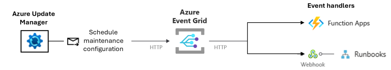 Azure 更新管理器使用事件网格在计划的维护配置上创建和管理前置事件和后置事件。 在事件网格中,可以从事件处理程序(如 Azure Webhook、Azure Functions 等)中进行选择,以触发前和发布活动。