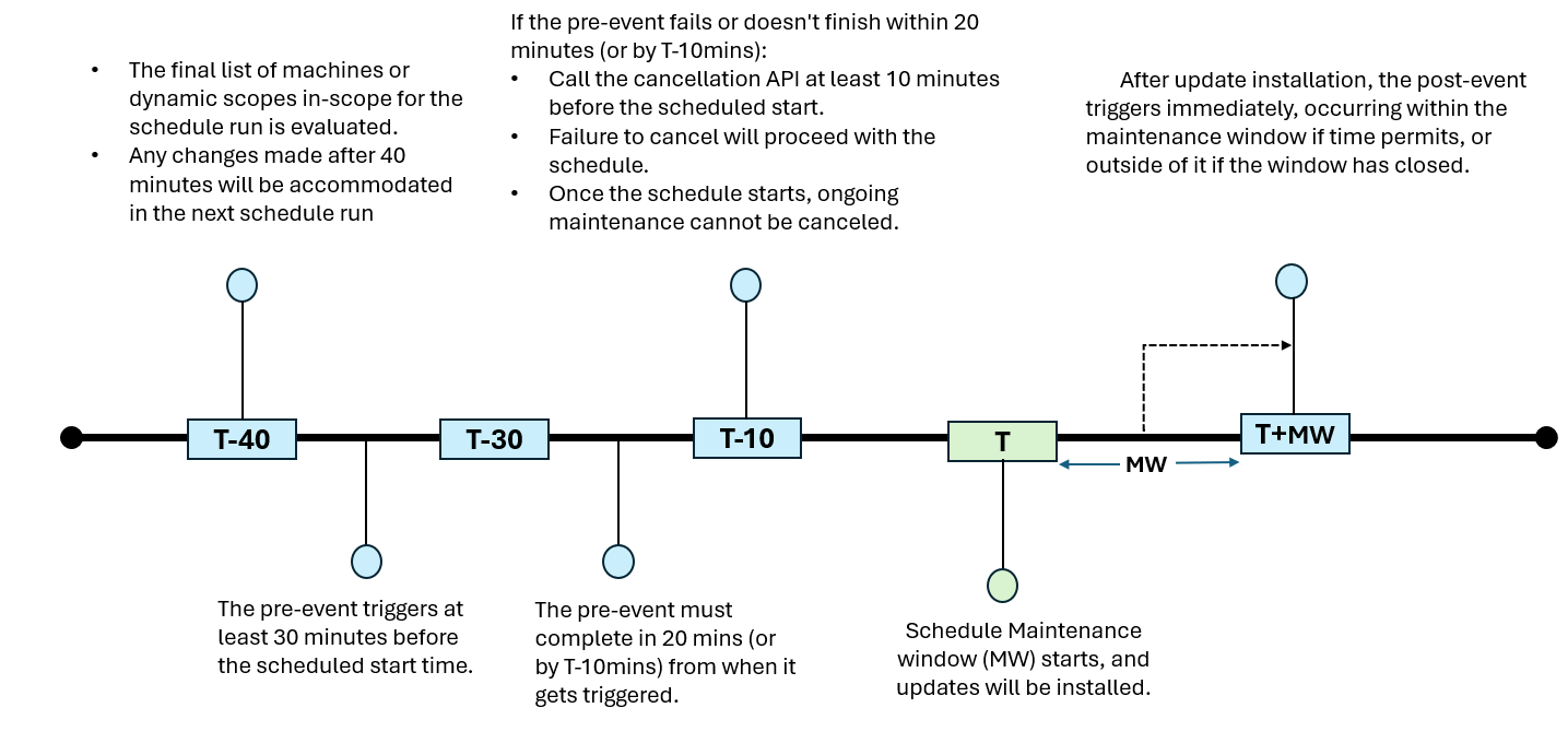在 Azure 更新管理器中,前置事件在维护时段外运行,后置事件可能在维护时段外运行。 你必须计划在计算机上完成计划执行所需的此额外时间。