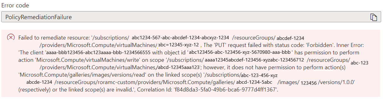 对于图库映像和具有加密磁盘的映像,策略修正任务发生故障。 VM 在 VM 模式下引用库映像时存在修正失败。 托管标识需要库映像的读取权限,但它目前不属于虚拟机贡献者角色的一部分。