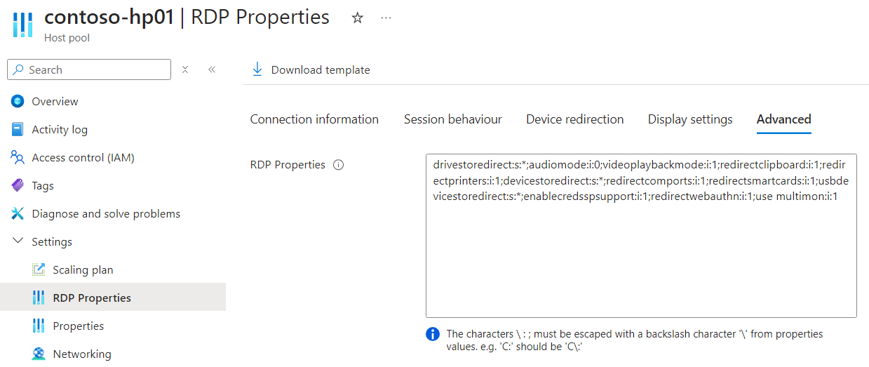 有关支持的属性和值的完整列表,请参阅 Azure 虚拟桌面支持的 RDP 属性