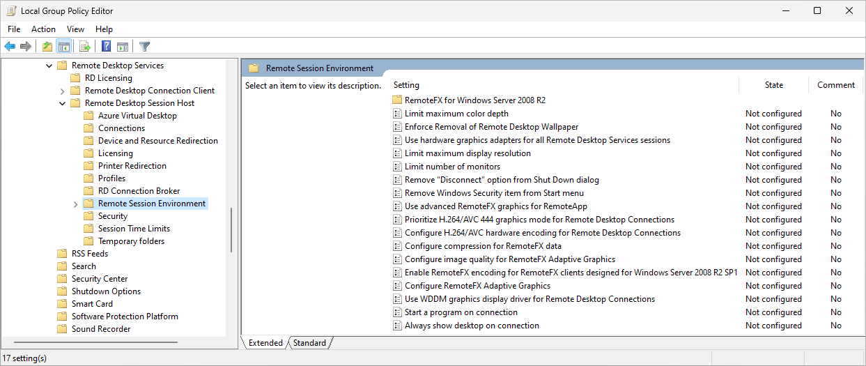 在设置选取器中,浏览到“管理模板”>“Windows 组件”>“远程桌面服务”>“远程桌面会话主机”>“远程会话环境”。