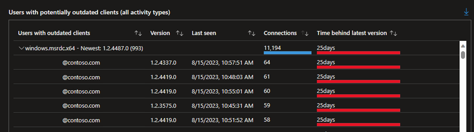 在下面的示例中,适用于 Windows 的 Microsoft 远程桌面客户端 (MSRDC) 的最新版本为 1.2.4487.0,目前有 993 个用户使用旧版本。 它还显示了连接计数以及旧客户端落后于最新版本的天数。