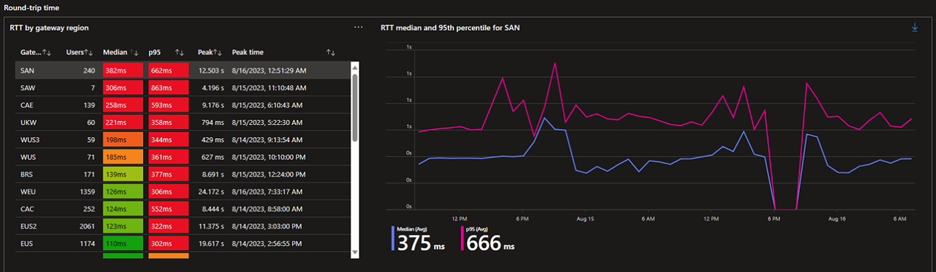 对于“RTT (按网关区域)”表,请选择“中值”,直到它旁边的箭头向下,以按延迟中值按降序排序。 此顺序突出显示了用户以最高延迟访问的网关,这些网关可能会产生最大影响。 选择网关以查看其 RTT 中值和第 95 百分位的图形,并按特定区域的 RTT 中值筛选 20 个排名靠前的用户的列表。