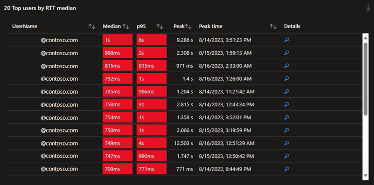 用户列表可用于确定受这些问题影响的用户。 可以选择“详细信息”列中的放大镜图标,以进一步向下钻取数据。