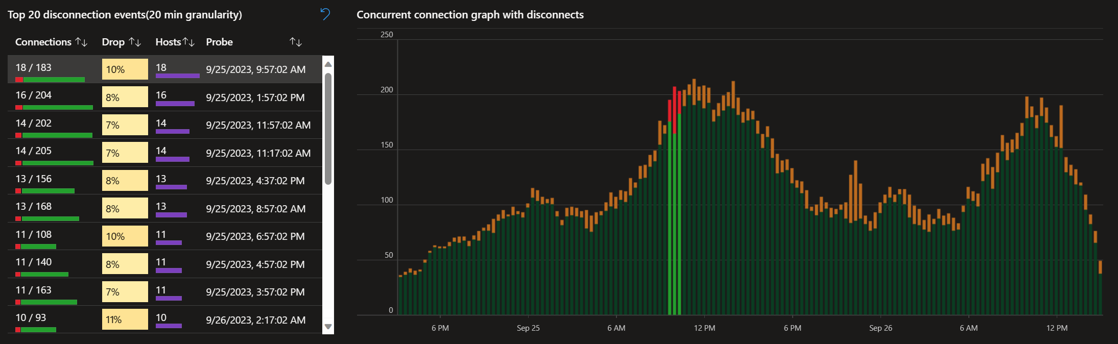 显示前 20 个断开连接事件的表,其中列出了发生最多次断开连接的前 20 个特定时间间隔。 可以选择表中的一行来突出显示连接图的特定段,以查看在这些特定时间段内发生的断开连接数。