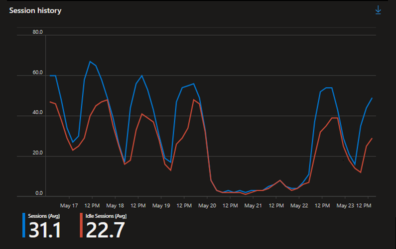 查看“会话历史记录”图表,其显示一段时间内活动和空闲(断开连接)会话的数量。 根据峰值用户会话计数和出现峰值的时间段确定任何高活动时间段和低活动时间段。 如果你发现定期重复的活动模式,这通常意味着有实施缩放计划的好机会。