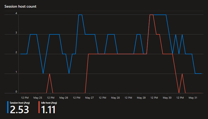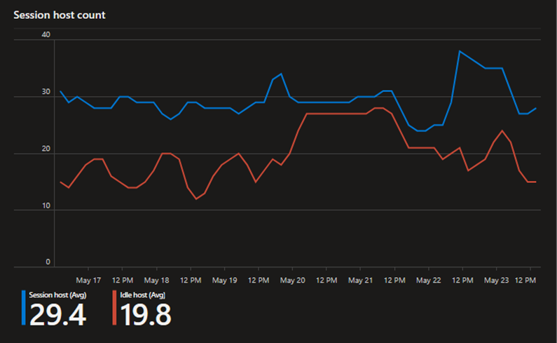 在此示例中,该图显示在一周的时间里,有很长一段时间空闲的会话主机处于开机状态,从而增加了成本。