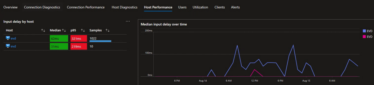查看表“输入延迟(按主机)”和图“一段时间内的输入延迟中值”,以查找主机池中每个会话主机的中值和第 95 百分位用户输入延迟值的摘要。 理想情况下,每个主机的用户输入延迟应低于 100 毫秒,值越小越好。