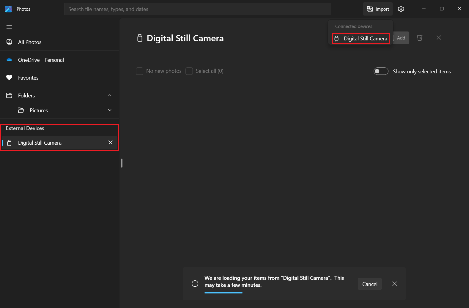 从“开始”菜单打开远程会话中的“照片”应用(来自 Microsoft)。 选择“导入”,并检查已重定向的设备显示在连接的设备列表中。