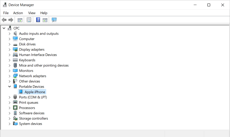使用 USB 重定向,iPhone 在“设备管理器”的“便携设备”下被列为应用程序的“Apple iPhone”: