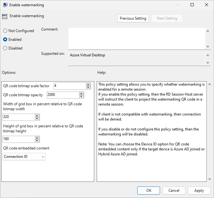 水印以及屏幕捕获保护有助于防止在客户端终结点上捕获敏感信息。 启用水印后,QR 码水印会显示为远程桌面的一部分。 QR 码包含远程会话的连接 ID 或设备 ID,管理员可以使用它来跟踪会话。 使用组策略的会话主机上会配置水印是,并由 Windows 应用或远程桌面客户端强制实施。