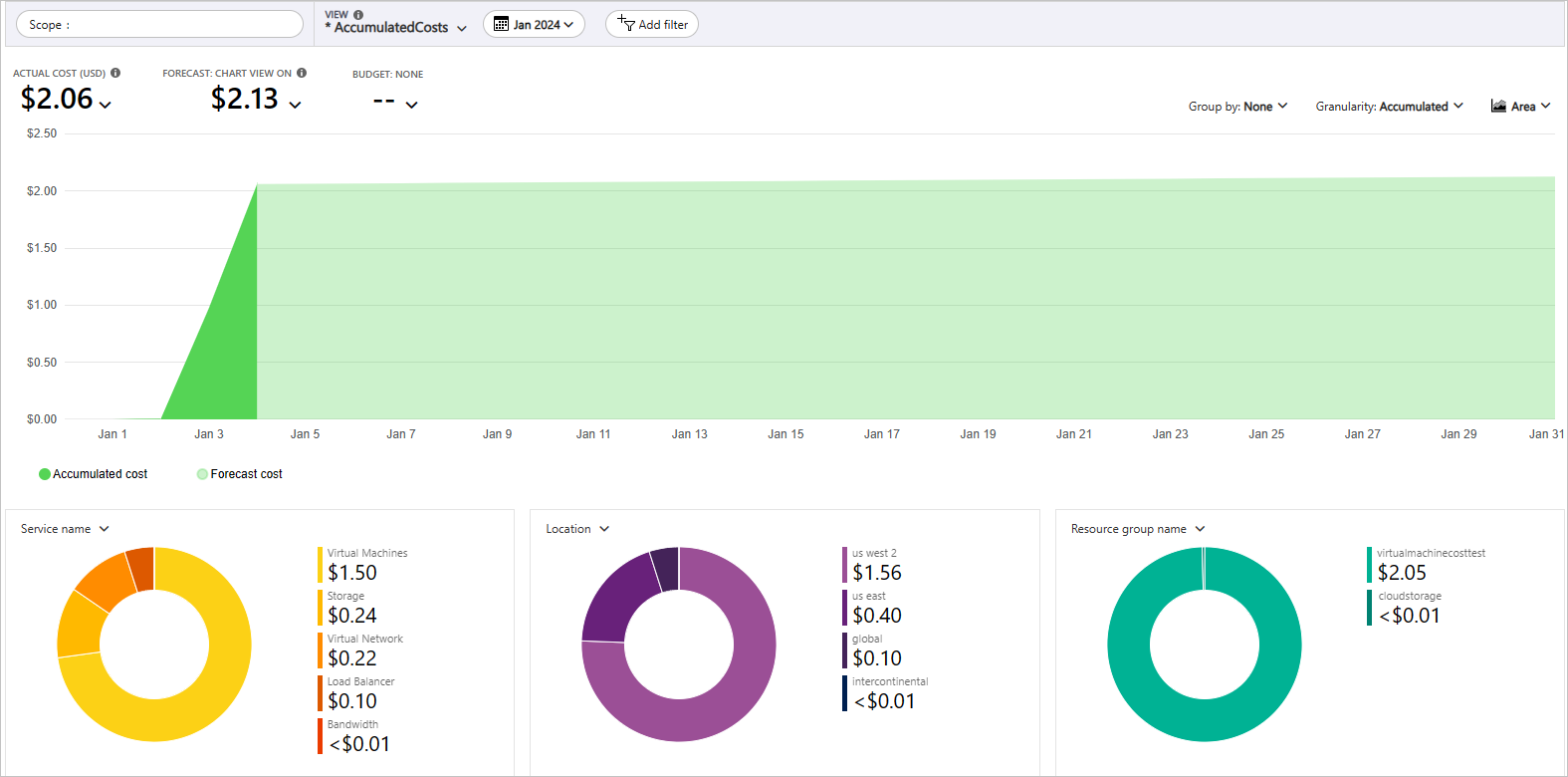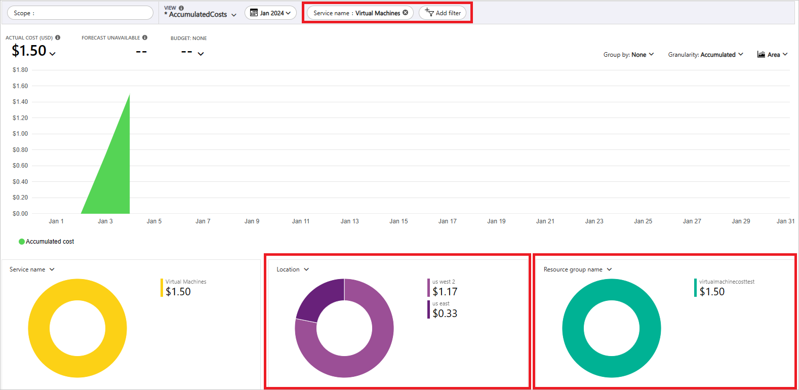 在前面的示例中,你将看到该服务的当前成本。 还可显示按 Azure 地区(位置)统计的成本以及按资源组统计的虚拟机成本。 从这里,你可以自行探索成本。
